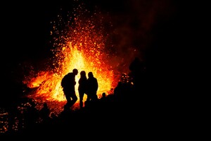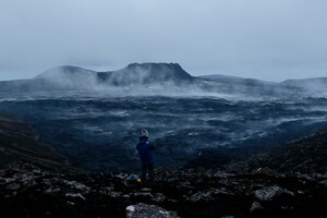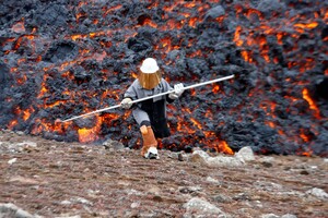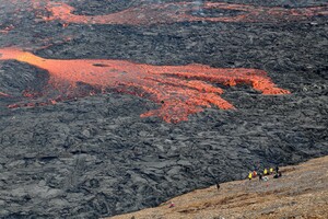 Le volcan ne semble pas prêt de se calmer et la lave décide de couler vers le Nord. Je longe la coulée. J’y croise une volcanologue islandaise qui explique à ses deux étudiantes comment prélever des lambeaux de lave. Ce que l’on pourrait croire facile au premier abord est plutôt difficile. La lave visqueuse ne se laisse pas faire! Cette coulée qui commence à inquiéter les autorités si elle venait à déborder de la vallée Meradalir se calmera finalement.