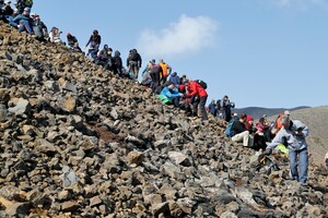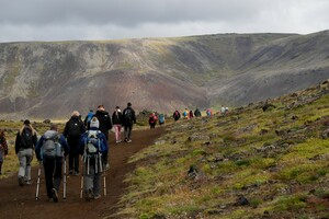 La première partie du trajet se fait sur le chemin déjà tracé. Un terrain plat suivi d’une forte montée. La seconde moitié consiste à contourner l’ancien site volcanique du Fagradalsfjall par l’Ouest en traversant un plateau. Peu de descentes et montées, mais un sol composé de pierres et de tourbe. Chaque pas demande réflexion: poser le pied un peu vers la droite ou vers la gauche, sur le coin de tourbe ou le caillou proéminent ? Et ne pas oublier de scruter les autres randonneurs, ceux que l’on dépasse, ceux qui nous dépassent et ceux qui arrivent en sens inverse! Les autorités ont profité des derniers jours pour baliser les accès avec des poteaux et des engins de chantier commencent à niveler le chemin.