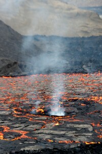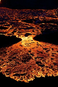 Pendant ces trois séjours sur zone nous assistons également à plusieurs épanchements de lave; de façon soudaine, la lave envahit la surface d’une coulée précédente offrant des motifs incandescents variés, des bras de coulées s’en échappent, eux-mêmes se ramifiant dans des petits filets de lave tels des doigts.