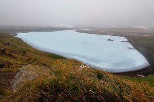 Mardi 9 août. Nous sommes tous les trois en Islande. La tempête s’abat depuis la veille sur la région et l’accès au volcan est fermé. La police nous dissuade de nous y aventurer, et de toute façon on n’y voit rien! Les secours sont déjà assez occupés à secourir des touristes égarés et de plus mal équipés. Alors qu’une nouvelle vague de canicule s’abat sur la France, nous sommes sous une petite pluie bien froide. Maximum de 13 degrés en journée… C’est dur pour Fady qui entame son second jour bloqué par la météo… il se voit déjà reprendre l’avion du retour sans avoir aperçu la moindre incandescence. En attendant une accalmie annoncée pour les jours prochains nous visitons les solfatares de Seltún et la zone géothermale de Gunnuhver. Sous un ciel bien bas, l’ambiance est bien volcanique et n’a rien à voir avec celle de l’an dernier sous le soleil.