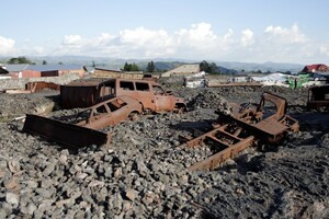 Dans l’après-midi, à Goma, nous traversons les coulées de lave qui ont coupé la ville en deux en 2002, avant de se jeter dans le lac Kivu. Aujourd’hui encore, la ville en garde des séquelles. Des carcasses de camions et voitures prises dans la coulée témoignent de l’emplacement d’un ancien garage. Les étages supérieurs des habitations sont devenus des rez-de-chaussée.