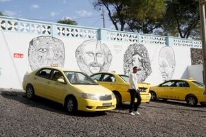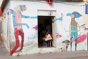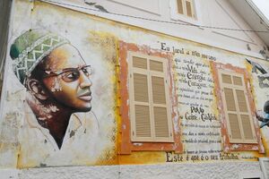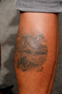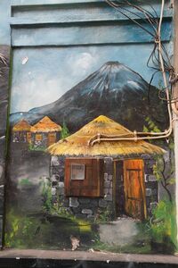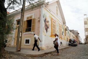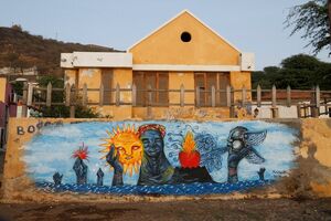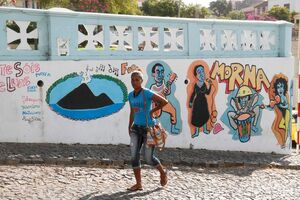 Pour l’instant le volcan du Fogo ne nous apparait que sur le mollet de Lucas notre guide et sur le mur d’un restaurant de Praia!