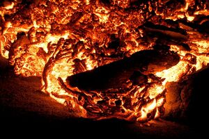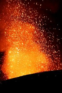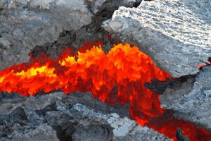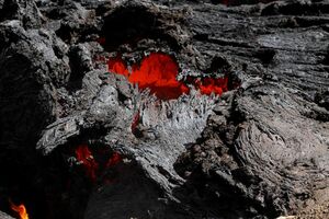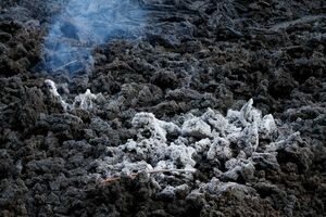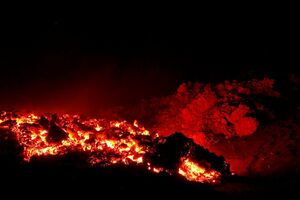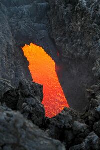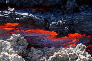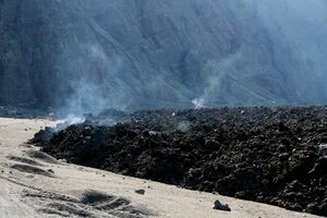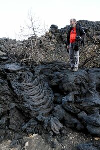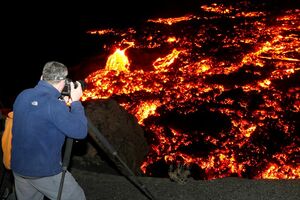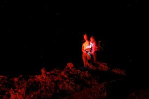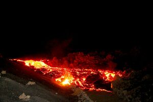 Le soir arrive, nous rejoignons le front d’une coulée de lave. Doucement mais sûrement la lave avance et la chaleur qui en rayonne nous impose de reculer sans cesse.
