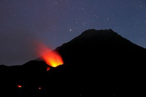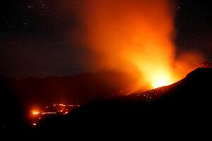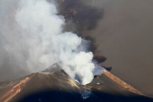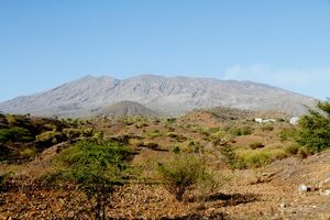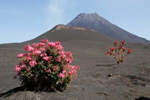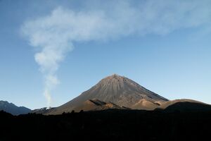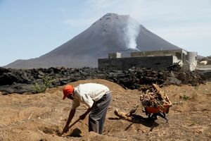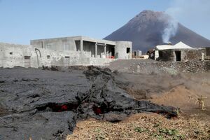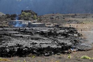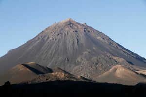 Le Pico do Fogo, sommet du volcan, avec ses 2829 m d’altitude est également le point culminant du Cap-Vert. Il n’est plus actif depuis 1921. Les dernières éruptions, en 1995 par exemple, ainsi que l’actuelle, ont eu lieu sur ses flancs. Un panache blanc est bien visible au dessus du cratère actif.