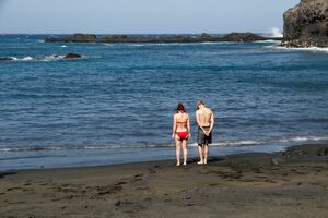 Baignade et repos en bord de mer sur la côte nord-ouest de l’île à la petite plage de Ponta Da Salina. L’origine volcanique de ce sable noir ne fait pas de doute!