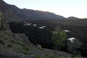 Quelques arbustes sous une belle lumière, contrastent avec l’ombre de la paroi de la caldeira. Le rempart montagneux de la caldeira plonge celle-ci progressivement dans l’ombre dès 15-16h environ.