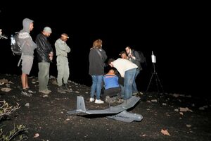 Une coulée de lave approche de la route de contournement, nous la rejoignons en quelques minutes. Avant de repartir certains d’entre-nous accompagnent des volcanologues au sommet d’un ancien cratère, le Monte Beco. Un vol de drone devrait permettre de faire des mesures de gaz dans la caldeira. Le Monte Beco offre également un bel aperçu sur le cratère actif du Fogo, à la condition d’avoir une longue focale.
