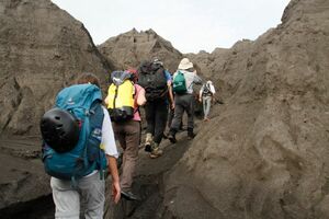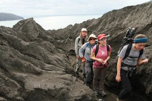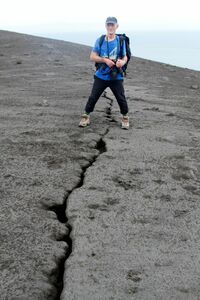 Après une traversée en bateau assez agitée, nous approchons de l’Anak Krakatau. Depuis plusieurs jours il n’y plus d’éruption. C’est largement suffisant pour que Guy notre guide nous propose de débarquer. Vers 18h00 locales nous foulons le sol. Nous sommes sûrement les premiers. D’après mon GPS nous sommes en mer pour près de 45 mètres!