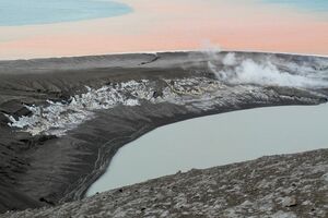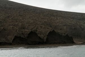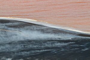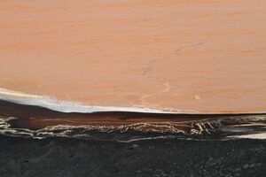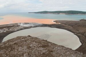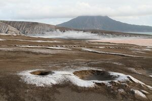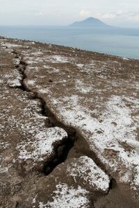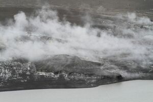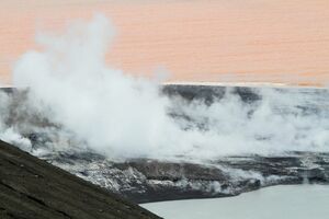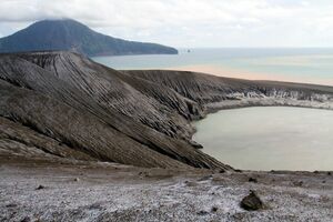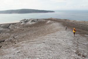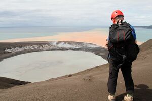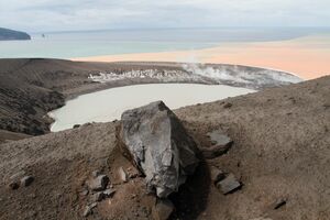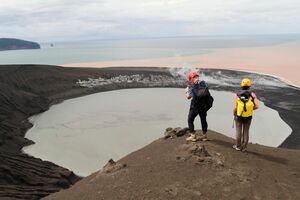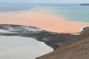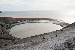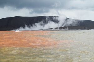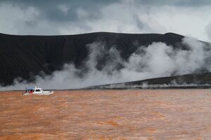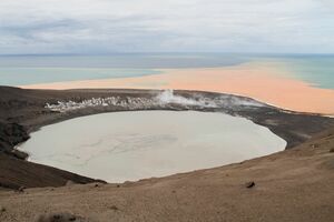 Devant nous, à nos pieds, un lac de cratère a pris la place du cône disparu. Il est situé au niveau de la mer. Un rapide calcul basé sur les images satellites donne un diamètre voisin de 400 à 450 mètres. Une bande de terre présentant des signes d’activité fumerollienne le sépare de la mer sur laquelle une large trainée orangée apparait. A priori cette couleur serait due à l’interaction entre les cendres riches en fer et l’eau de mer.