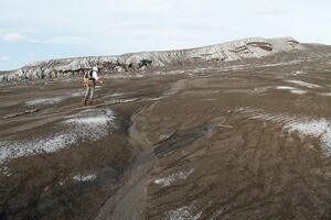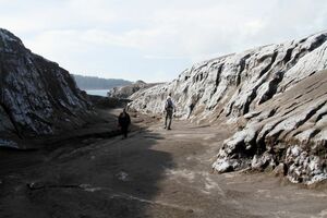 Au courant de la journée, le sol se part d’une parure blanchâtre, sans doute des dépôts de gaz précipités par l’interaction avec l’humidité de l’air ambiant.