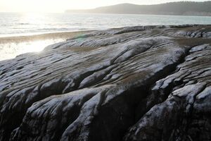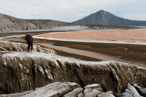 En milieu d’après-midi, nous prenons la décision de descendre dans cette ‘baie’ formée par les deux bras encerclant le lac. Nous constatons rapidement que cette zone nord de la baie est beaucoup moins tourmentée que le versant est de l’île et ses innombrables ravins. Par comparaison rejoindre la mer depuis le sommet est presque une promenade. Reste bien-sûr le danger d’une éruption qui pourrait être mortelle pour nous.