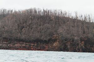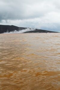 Approche de la côte ouest. Niché au coeur de l’anse nouvellement formée, le lac de cratère n’est pas visible au niveau de la mer, caché derrière un rideau de fumerolles. La mer prend une coloration orangée: phénomène chimique ou simplement particules en suspension?