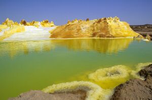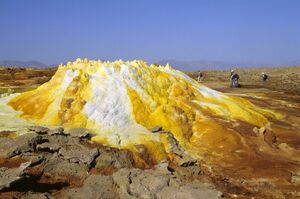 Départ le 27 au matin. L’hélicoptère est de retour et nous dépose à Dallol dans la dépression de Danakil. Altitude: -120 mètres!. Trois heures à comtempler le résultat de l’interaction entre volcanisme et hydrologie. Beaucoup trop court pour tout voir. Malgré la chaleur qui dépasse les 40°C (encore heureux que ce soit l’hiver) nous passerions bien une journée ou deux ici.