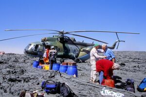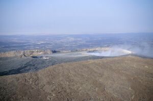L’approche par la voie des airs a l’avantage d’offrir un bon aperçu du site: une caldeira perforée de 2 pits cratères. Une forte activité fumerollienne est visible au cratère nord. Le sud ne laisse rien paraître, mais il héberge un des buts de notre voyage, un célèbre lac de lave. Nous ne sommes d’ailleurs pas seuls, un groupe de scientifiques est sur place depuis quelques semaines pour mener à bien une campagne de mesures.
