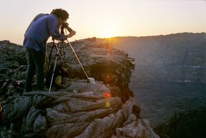 Rapidement, dès la fin du déchargement de l’hélicoptère, nous nous approchons des bords du cratère sud: le lac est vraiment petit, une trentaine de mètres au plus, perdu à 100 mètres de profondeur! Point positif, il n’y a que peu de gaz et la vision serait plutôt bonne s’il n’y avait pas cette lumière crue du soleil de la mi-journée. Les abords du cratère sont plutôt instables. Nous remarquons des éboulis sur la terrasse 60 mètres plus bas mais également au pied de celle-ci sur le plancher du cratère.