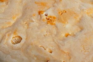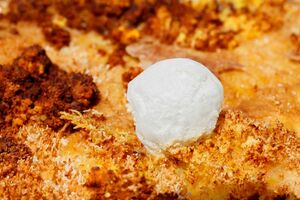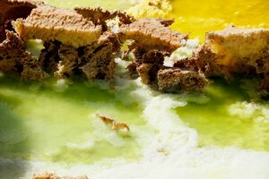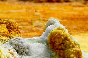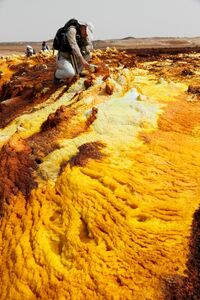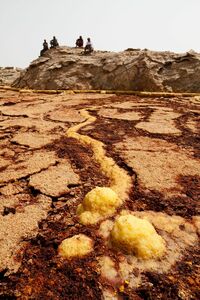 Dans le courant de l’après-midi visite de 2 sites au pied de la « colline » de Dallol. Un lac de Bischofite avec sa petite « rivière »: on pourrait presque croire voir couler de la cire de bougie! Le second lac est d’un noir profond et à sa surface apparaissent des petits bouillonnements jaunes vifs.