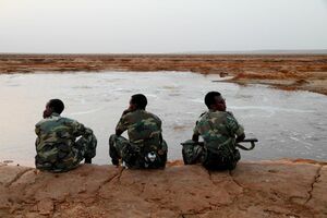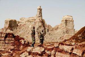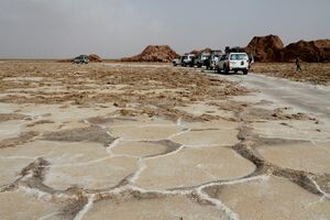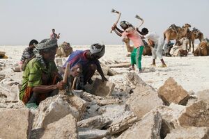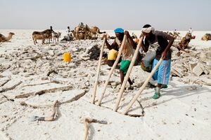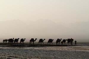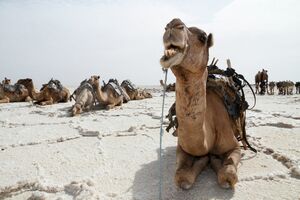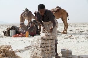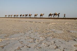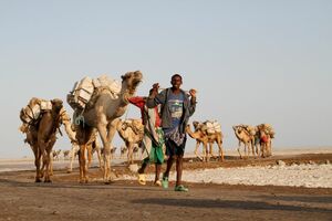 Nous partons à la rencontre des caravanes de sel. Les dromadaires, dans une démarche majestueuse, portent leur charge de plaques de sel. La modernisation arrive, le transport du sel à dos de dromadaires se limite maintenant au trajet du lac Karoum à Bera Ale et non plus Mekele. Malgré cela, la tâche reste rude.