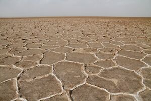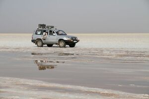 Matin du 23 janvier. En route pour Dallol nous roulons sur le lac salé Karoum. Les motifs géométriques de sa surface se sont formés lors de l’assèchement.
