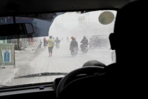 En route vers Pakem nous nous rendons compte qu’une éruption importante vient de démarrer. Une forte chute de cendres se mêle à la pluie et s’abat sur toute région; la visibilité ne dépasse maintenant pas quelques mètres. L’éclairage public s’est éteint et les seuls repères sont les phares des motos qui précèdent notre minibus dans la longue cohorte des personnes fuyant l’éruption. Cette obscurité n’est interrompue que par les fortes lueurs des éclairs qui parcourent les nuages de cendres, renforçant ainsi l’impression de fin du monde. Les vitres de nos minibus s’opacifient sous cette boue de cendre et les essuie-glaces ont fort à faire pour offrir quelques centimètres carrés de visibilité aux chauffeurs. Une odeur de brûlé envahie l’habitacle, ce ne sont pas les freins qui chauffent mais un mélange de bois, de végétation et de plastiques brûlés!