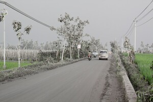 L’espoir d’une amélioration des conditions météos nous fait repartir sur les routes qui cernent le volcan. Contournant celui-ci par l’ouest nous bifurquons vers le poste d’observation de Babadan, traversant villages et rizières uniformément gris. Certaines toitures et bon nombre de palmiers n’ont pas résisté au poids de la cendre.