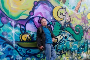 2023: Islande, Pascal Blondé devant un mur haut en couleurs de Reykjavik